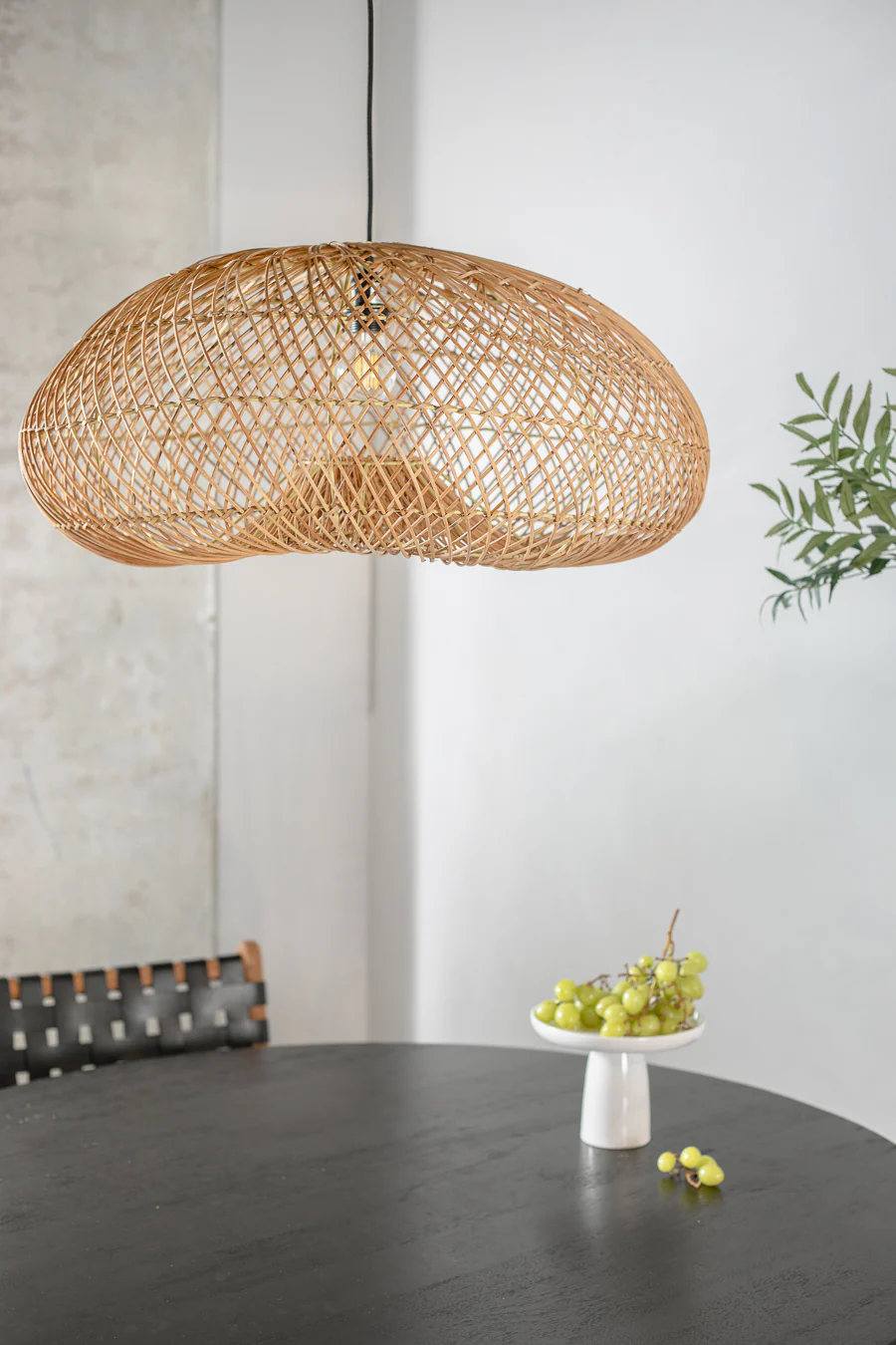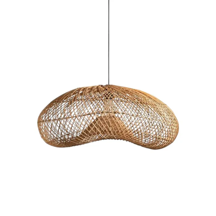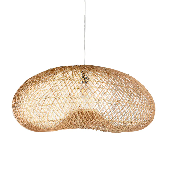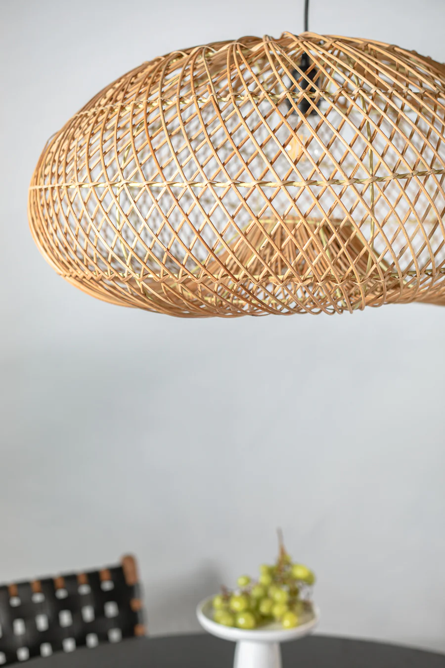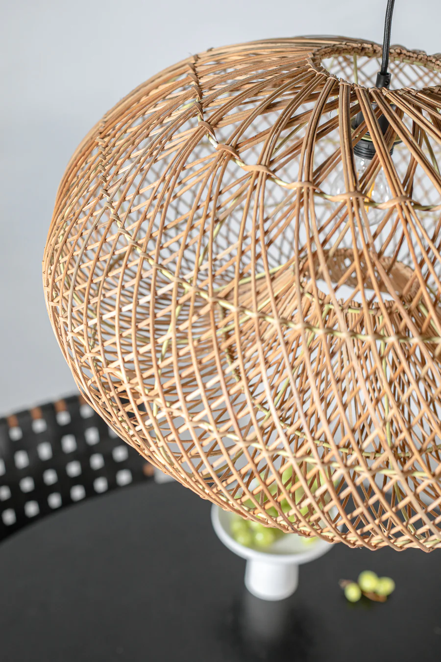 מנורה ריזורט בגוון טבעי. מנורת תלייה מעוצבת אריגת ראטן קעורה.