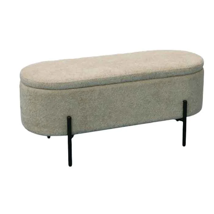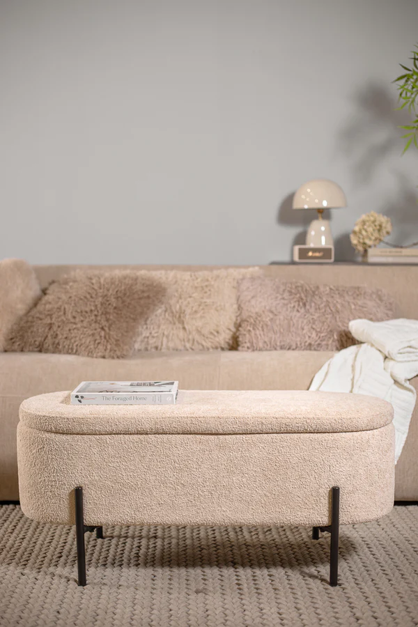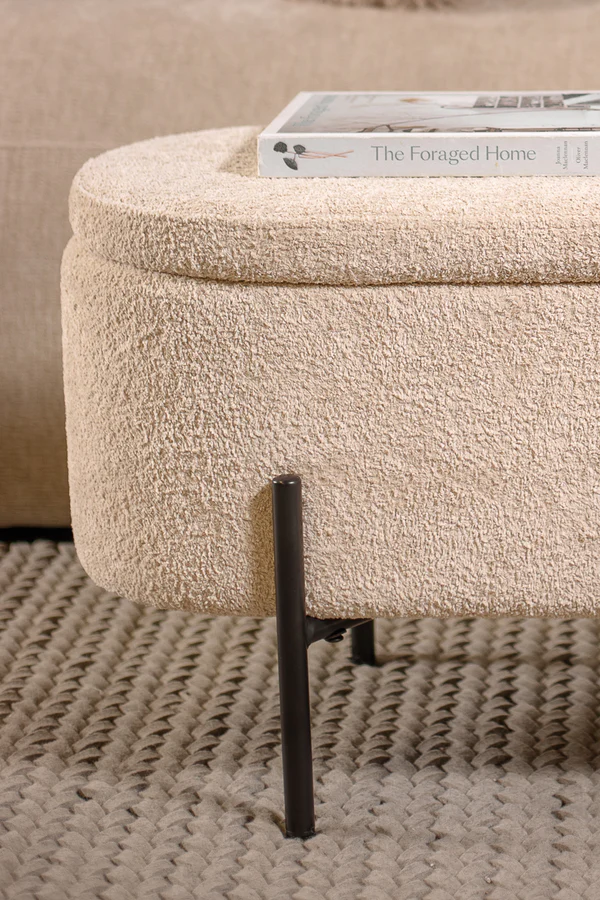 סטול איחסון לוקה בגוון בהיר. הדום אובאלי מעוצב, הנישא על רגלי מתכת שחורות.