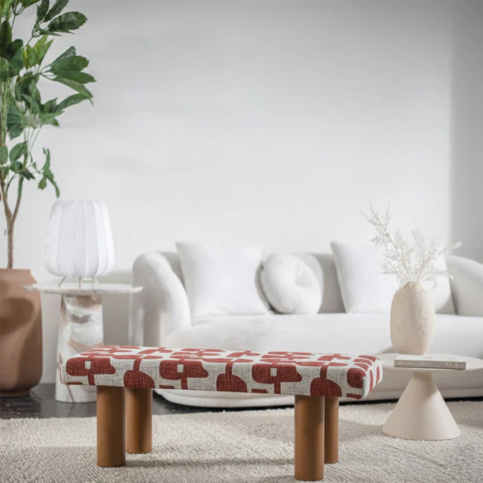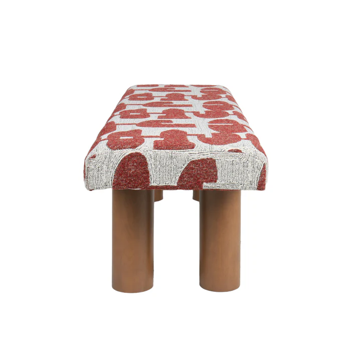ספסל אירוח בגוון אדום. סטול מעוצב מושב מרופד בד בדיגום ייחודי. ספסל מדויק הנישא על רגלי צילינדר עגולים, המשווים לו פרופיל ניגודי לצללית המלבנית של המושב. ספסל אירוח מודרני, מושלם להצבה בכניסה, למרגלות המיטה או בילל המגורים המרכזי.